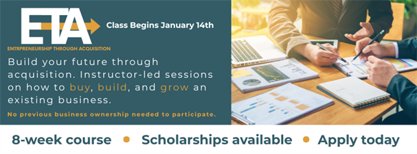 Applications are now open for Entrepreneurship Through Acquisition cohort 4! Ready to own a business without starting from scratch? Join ETA’s 8-week, instructor-led program and learn how to find, evaluate, and acquire an existing business. No business ownership experience is needed to participate.